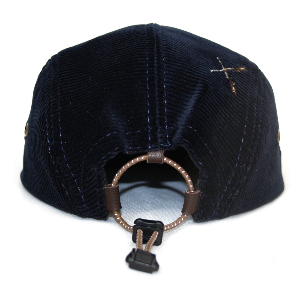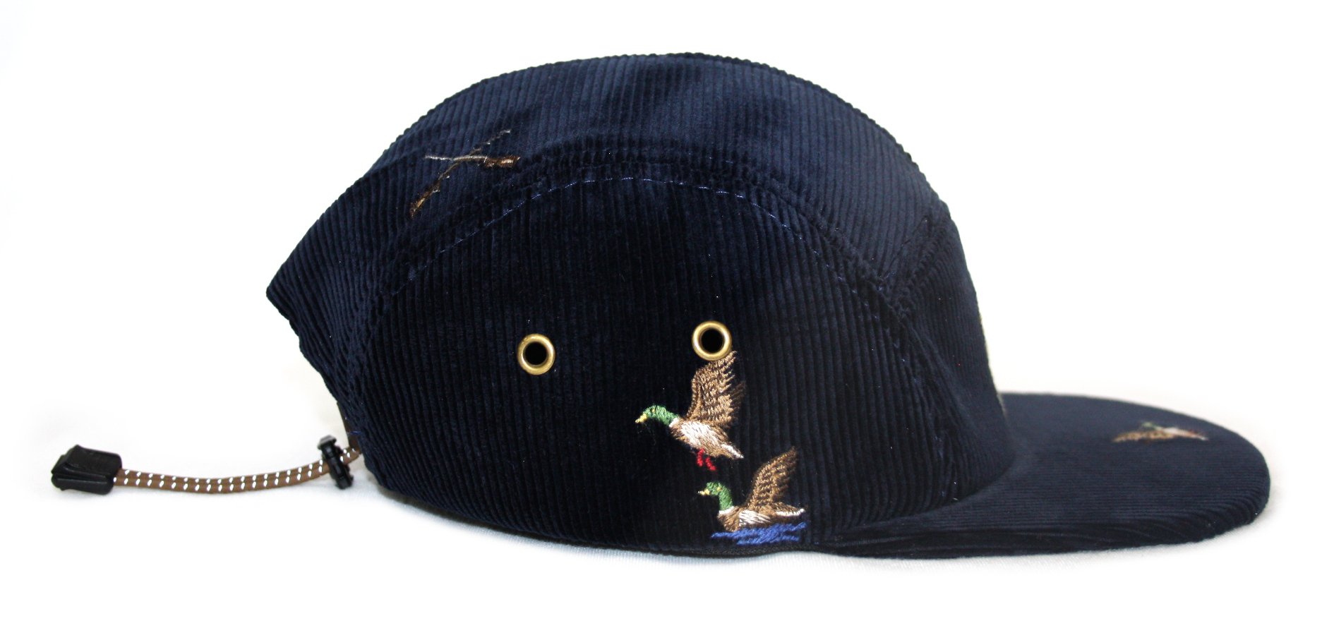 - Five panel cap made from embroidered duck pants.