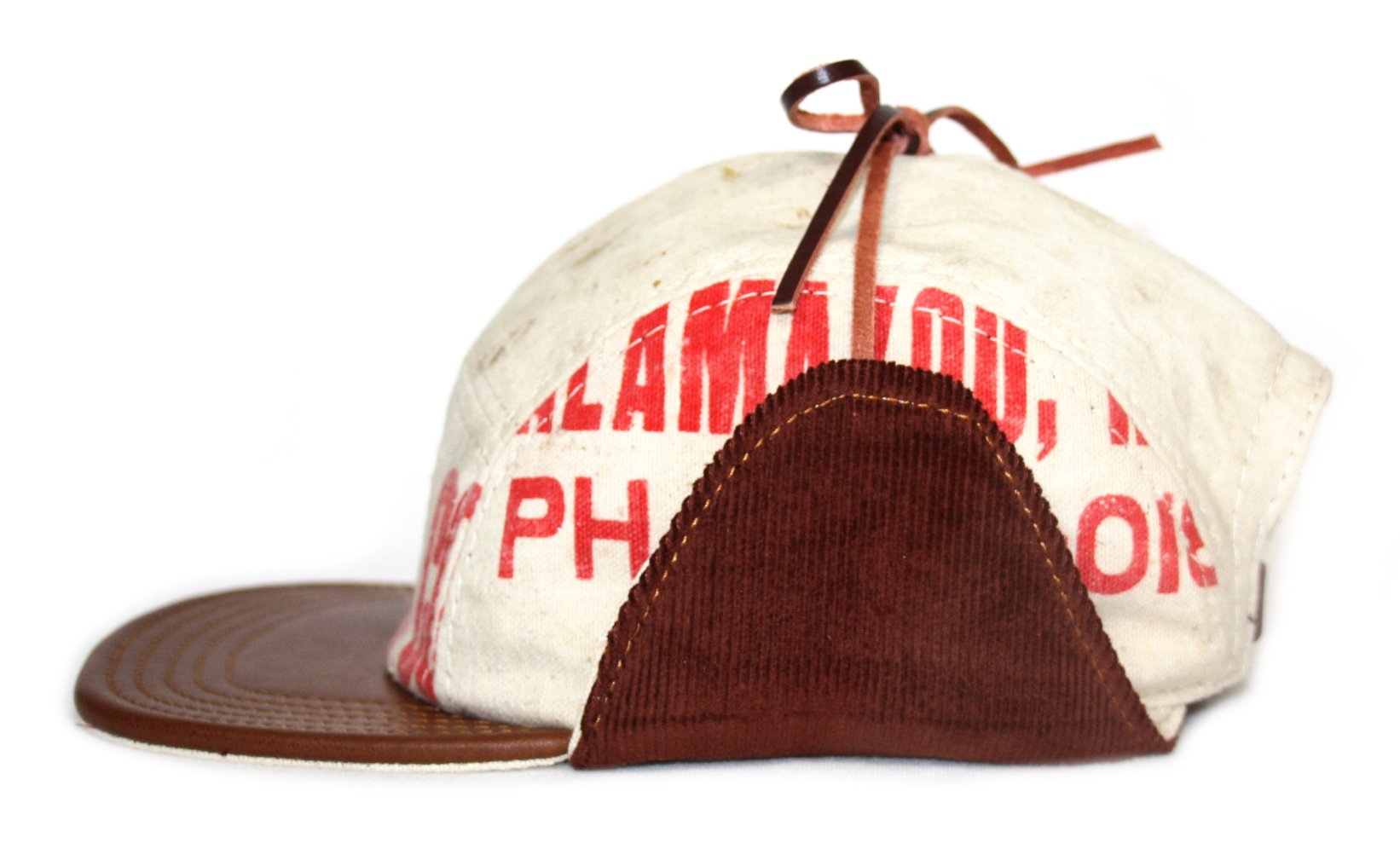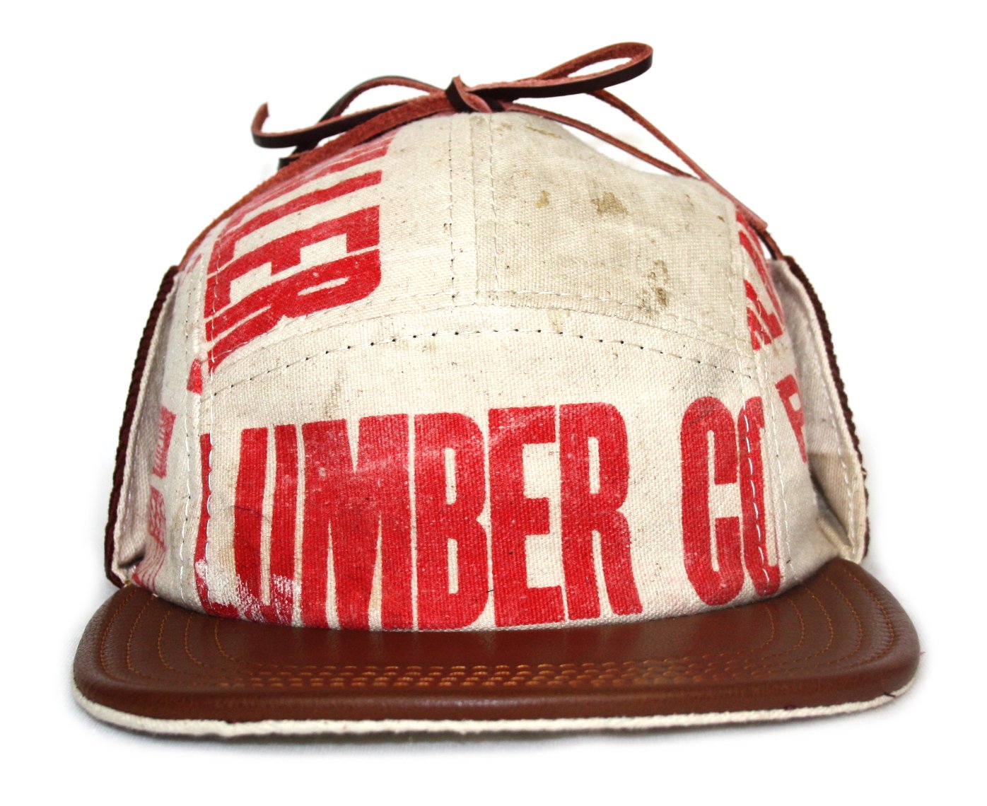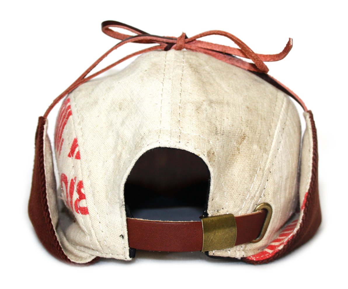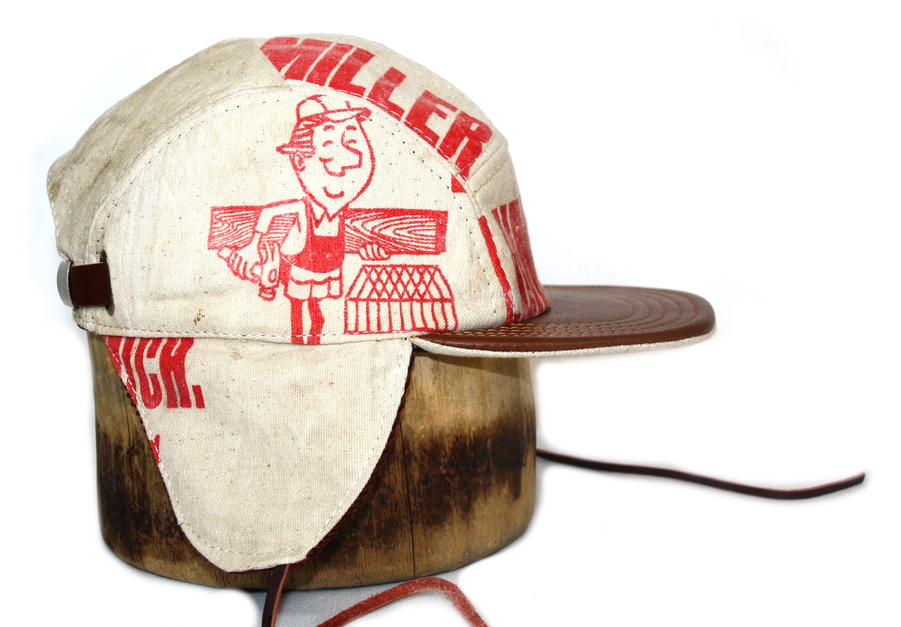 - Five panel trapper hat made from a vintage Lumber yard apron.