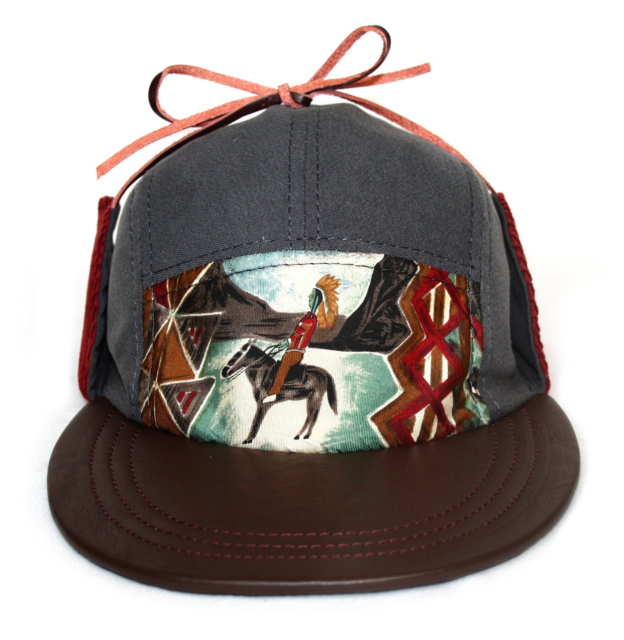 - Five panel trapper hat made from recycled hiking pant & corduroy materials. Front panel from a silk tie.