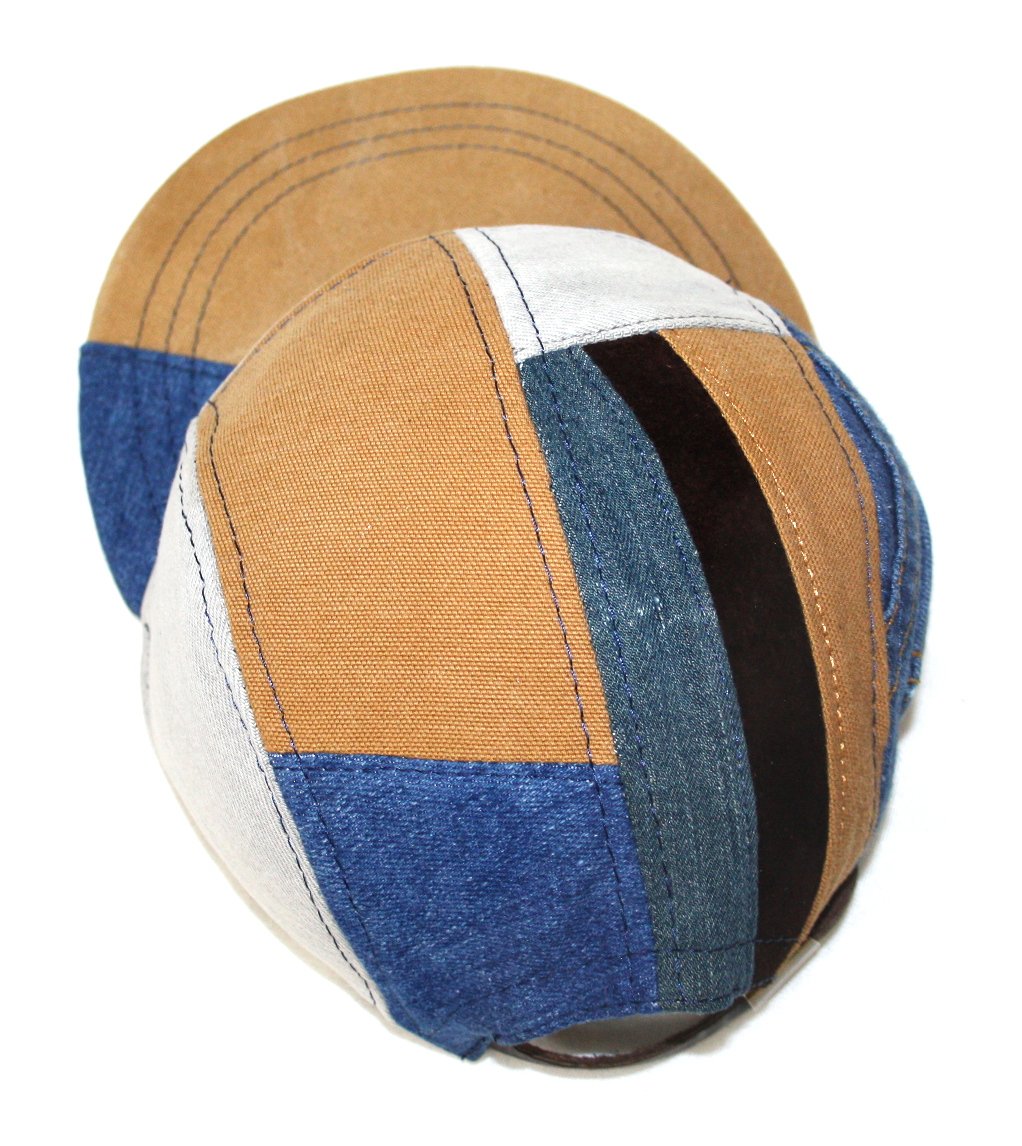- Hat made from recycle scrap materials including Levi's denim, leather, and suede fabrics.