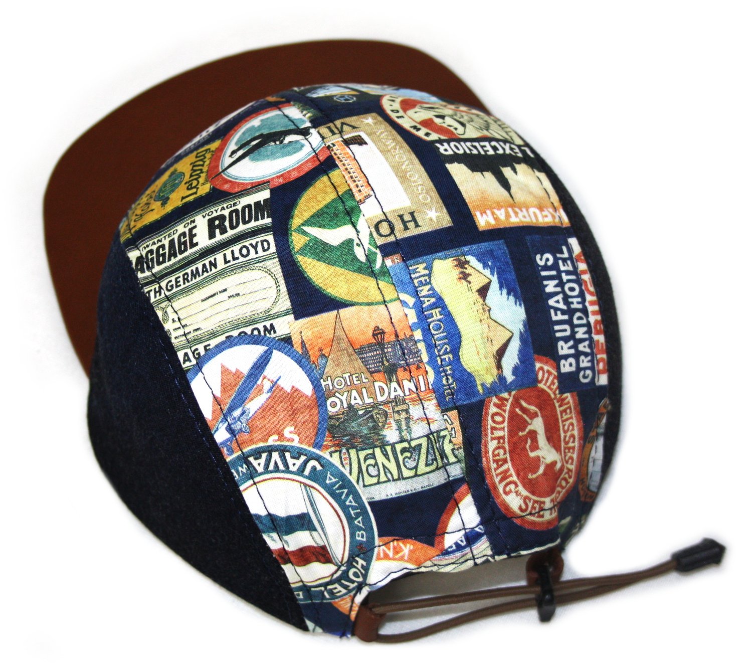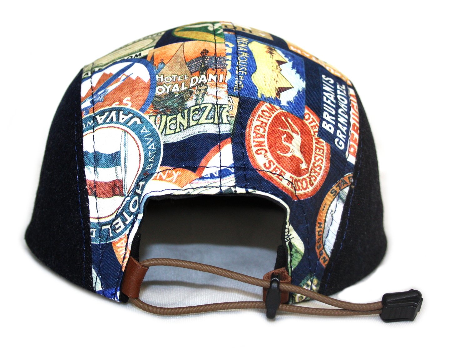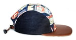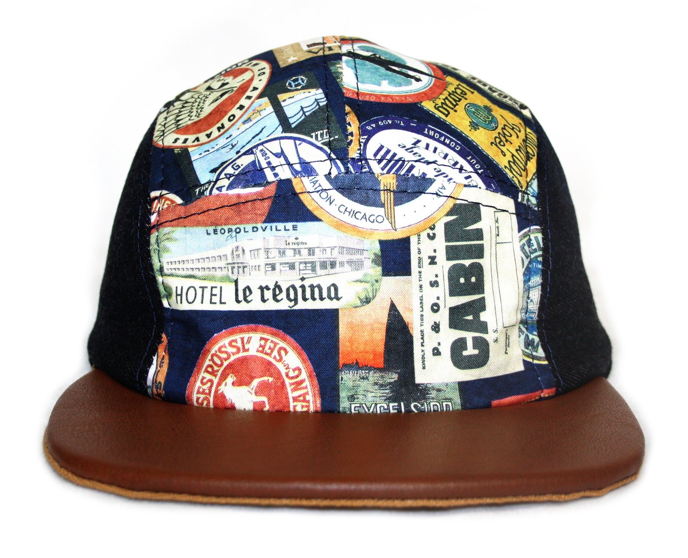 - Five panel cap constructed from vintage travel sticker fabric, Japanese denim, and leather.